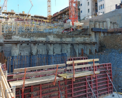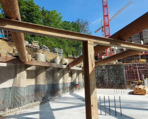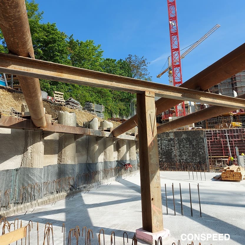Die Tiefbauarbeiten sind beinahe abgeschlossen: der unterste Abschnitt wird noch auf Garagenebene ausgehoben und die Stahl-Aussteifungen werden durch aussteifende Deckenscheiben ersetzt. 🏗